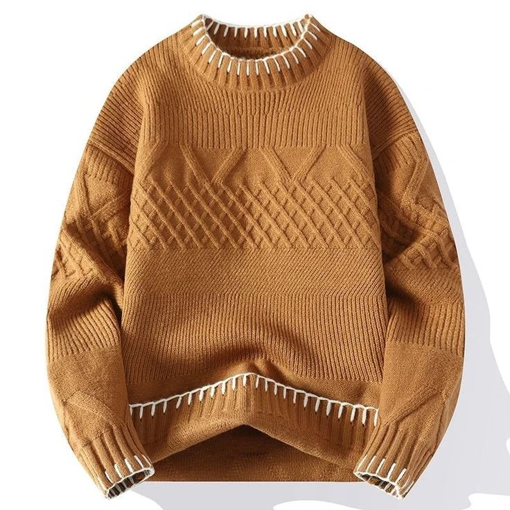 Stay cozy in style with the Orvin Camel Knit Sweater, featuring intricate diamond-texture patterns. The contrast stitching adds a modern edge, making it a versatile pick for everyday wear. Unisex fit for all-day comfort.
